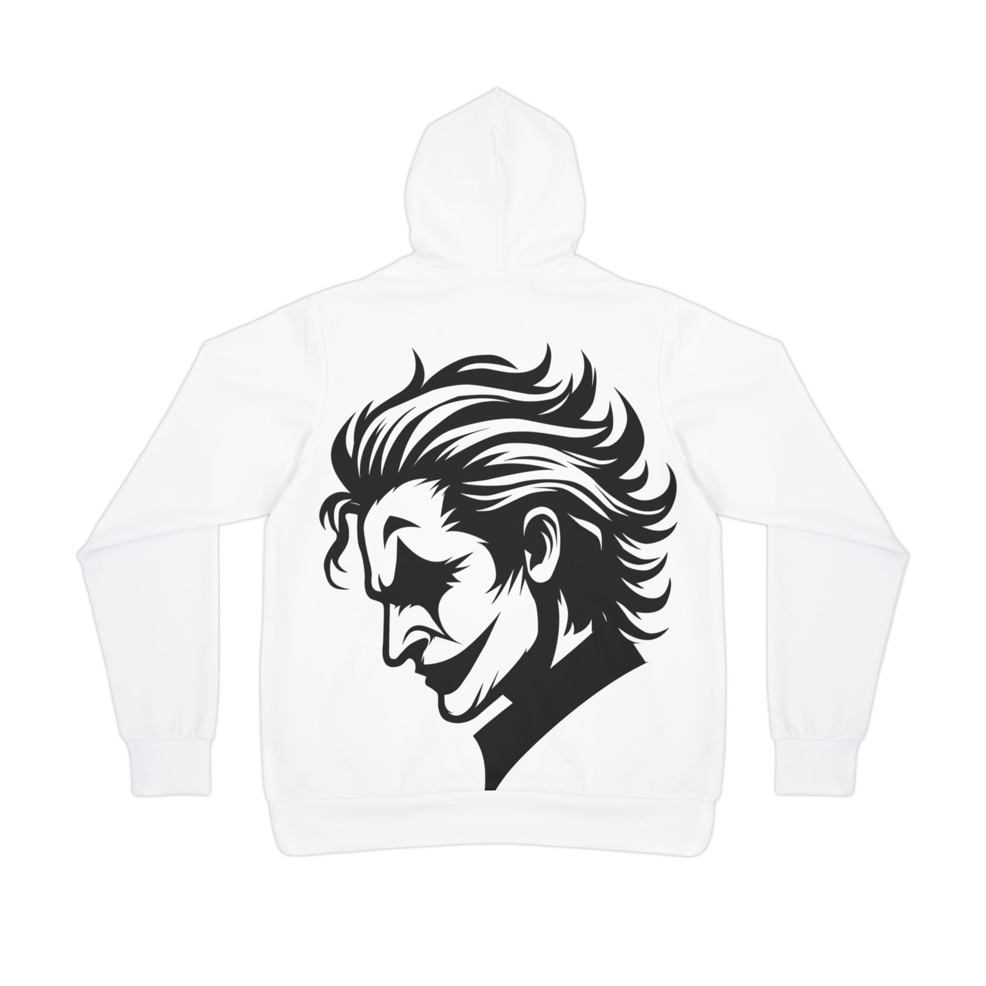 Crafted from an ultra-soft, eco-conscious fabric blend of 95% recycled polyester and 5% spandex, this hoodie delivers lightweight breathability and a smooth, flexible fit. The Joker-style graphic gives it bold personality, while sleek black drawstrings and a custom waistband label add a premium, personalized finish. With medium-weight durability, it’s perfect for layering through every season.
