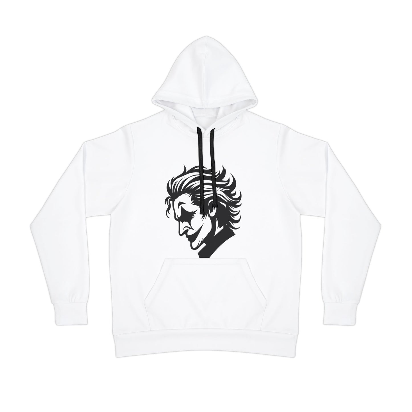 Crafted from an ultra-soft, eco-conscious fabric blend of 95% recycled polyester and 5% spandex, this hoodie delivers lightweight breathability and a smooth, flexible fit. The Joker-style graphic gives it bold personality, while sleek black drawstrings and a custom waistband label add a premium, personalized finish. With medium-weight durability, it’s perfect for layering through every season.
